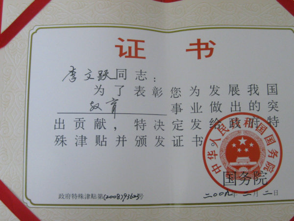 (通讯员 程志山报道)为了表彰中国工艺美术大师、我院副院长李文教授为我国教育事业做出的突出贡献,2009年2月2日,国务院特发给其政府津贴并颁发证书。